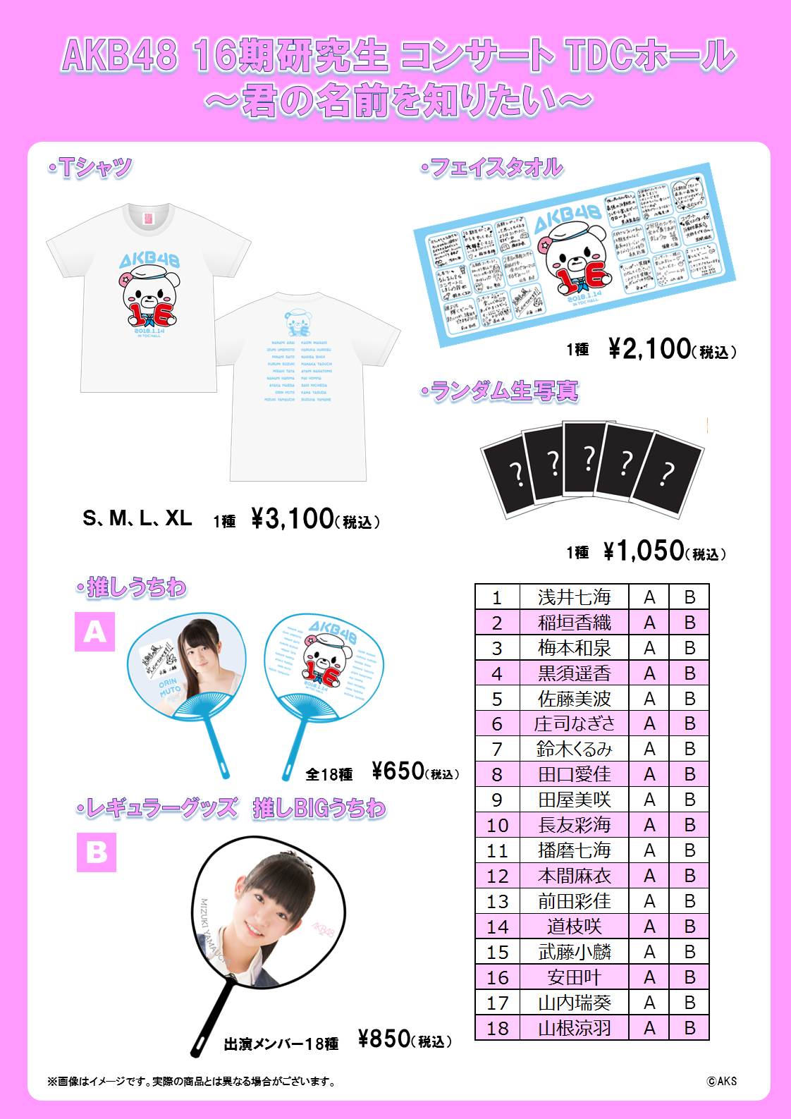 AKB48 16期生コンサート〜君の名前を知りたい〜 グッズ・生写真販売のお知らせ