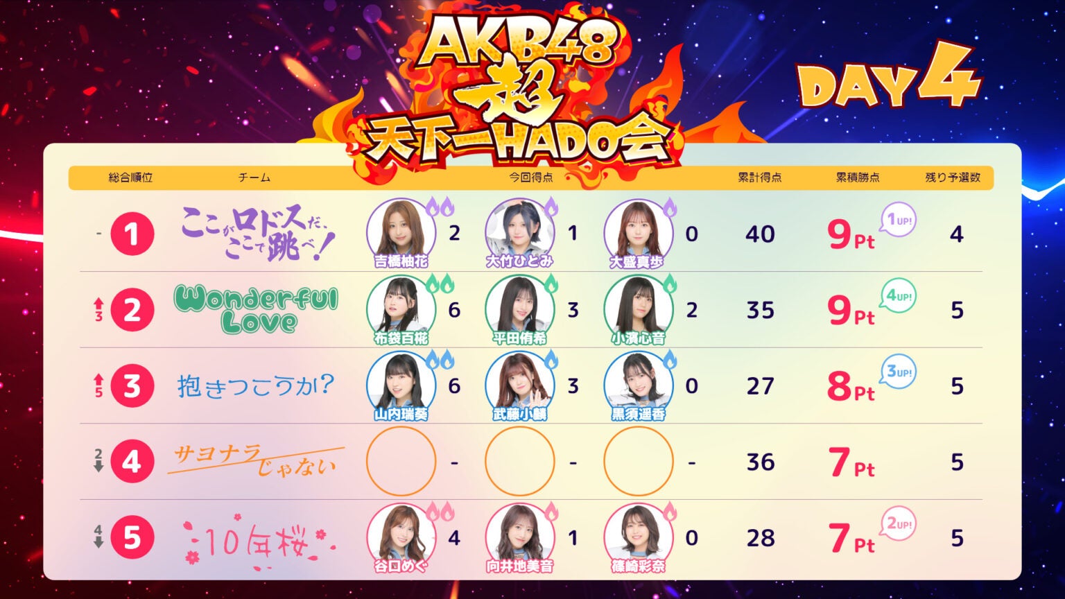 どのチームが1位に踊り出すのか?!DAY7は以下メンバーが出場!!
