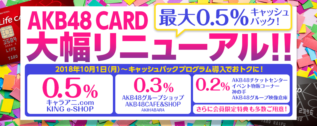 キャラアニ、AKB48グループチケットセンターなど8箇所の利用先で最大0.5%キャッシュバックの