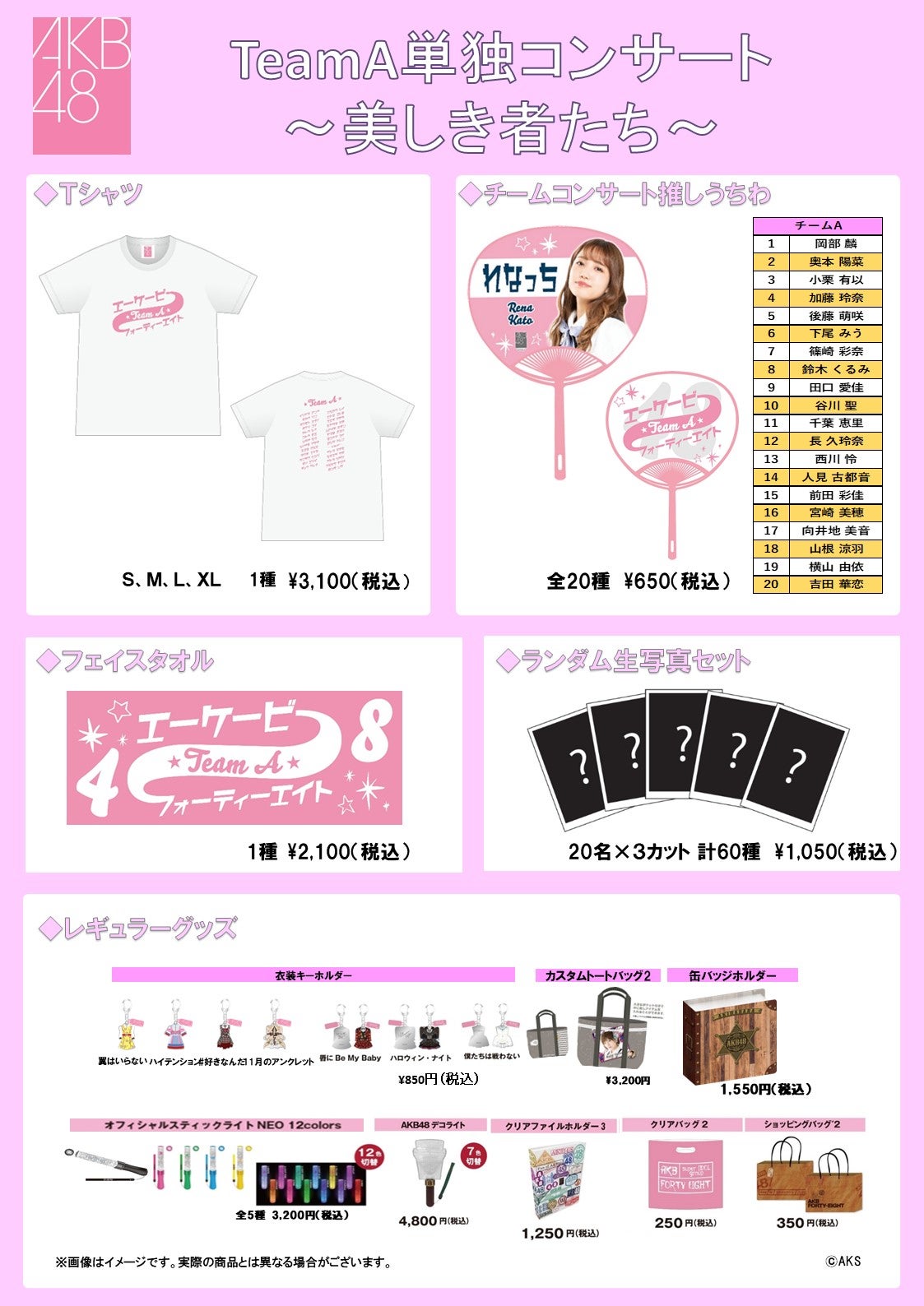 明日1/12(土)TOKYO DOME CITY HALLにて開催されます「チームA単独コンサート〜美しい者たち〜」「チームK単独コンサート〜チームKのKってなんのK?」のグッズ/生写真販売の詳細をお知らせします。