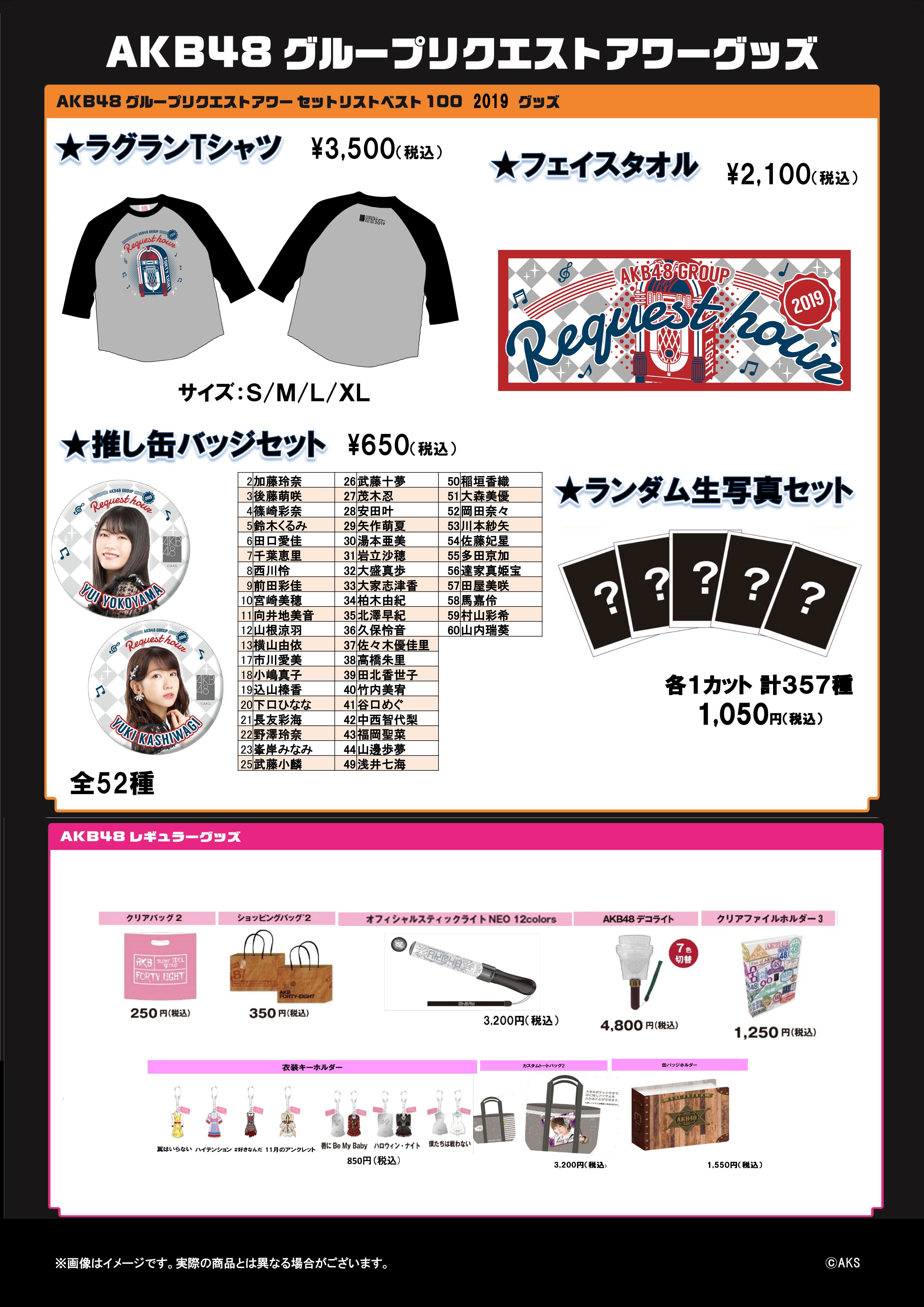 明日1/19(土)TOKYO DOME CITY HALLにて開催されます「AKB48グループリクエストアワー セットリストベスト100 2019」のグッズ/生写真販売の詳細をお知らせします。