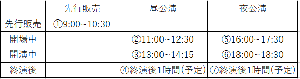 ※②⑤の開場中販売は、会場内での販売につき、該当公演のチケットをお持ちの方のみ商品をご購入いただけます。