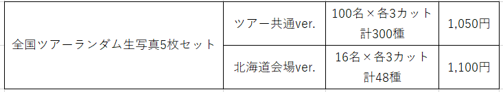 ・撮って出し生写真 L判 300円、L判+2L判セット 800円、L判+2L判+台紙付きセット 1,300円