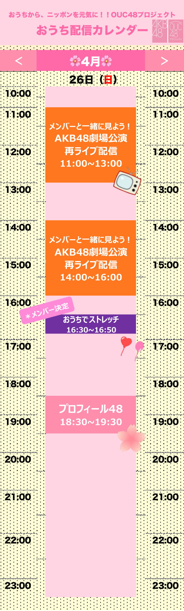 明日のおうち配信は「おうちでストレッチ」の他にも「メンバーと一緒に見よう!AKB48劇場公演 再ライブ配信」や、「プロフィール48」など盛りだくさん!!お楽しみに!!