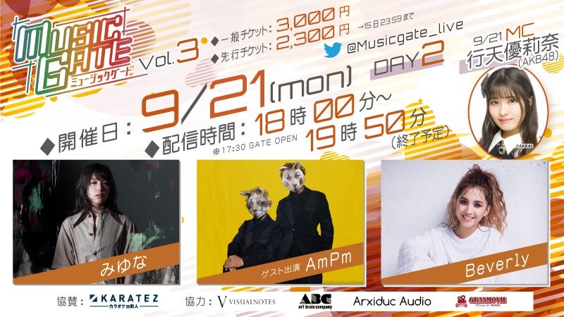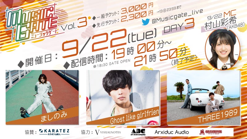 9/20(日)、21(月・祝)、22(火・祝) に開催される新感覚ライブ生配信イベント『MUSIC GATE vol.3』に、浅井七海、行天優莉奈、村山彩希が日替わりMCとして出演決定!!