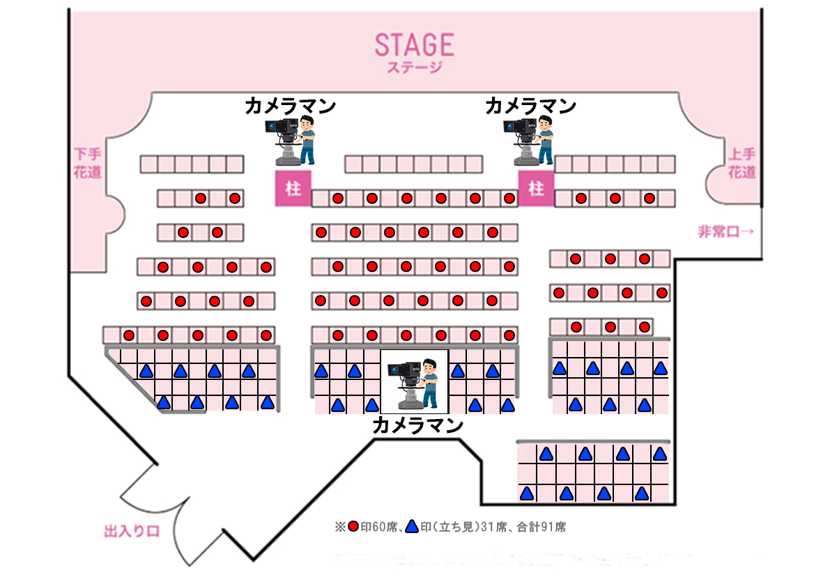 ・お客様がお座りになる座席は1席ずつ間隔を空けさせていただきます。また、最前列の座席は使用中止とさせていただきます。立見エリアは座席間の間隔に準じたスペースを空けさせていただきます。1公演あたりの定員は91名(座席60名、立見31名)となります。(図面参照)。観覧位置は当日の抽選にてご案内させていただきます。