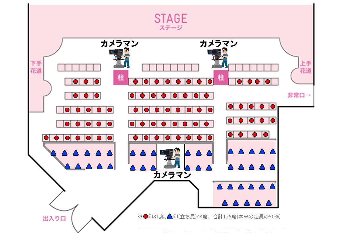 ・最前列の座席は使用中止とさせていただきます(図面参照)。観覧位置は当日の抽選にてご案内させていただきます。